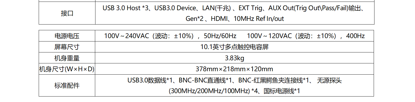 丰富的接口:USB 3.0 Host *3、USB 3.0 Device、LAN(千兆)、 EXT Trig、AUX Out(Trig Out\Pass/Fail)输出、Gen *2、HDMI、10MHz Ref In/Out。