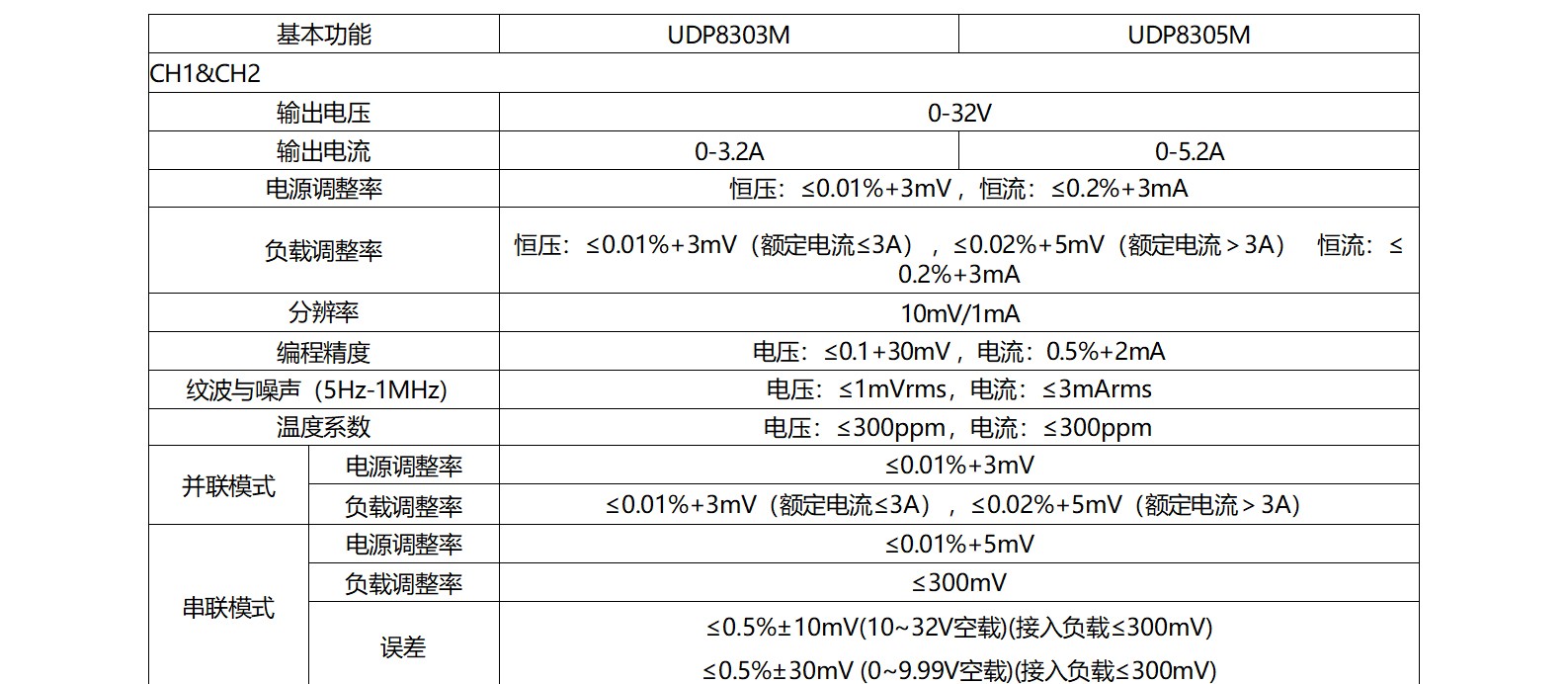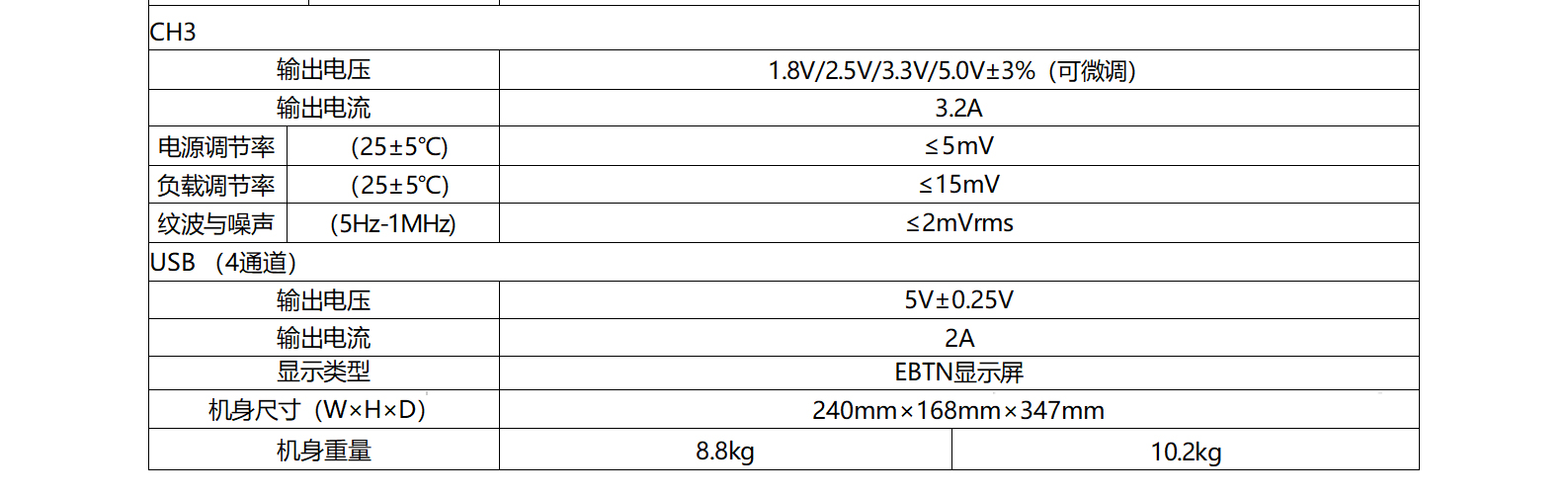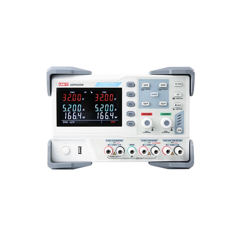 两组32V,3.2A/5.2A可调输出,一组固定可选输出1.8V/2.5V/3.3V/5V/3A,电压可调输出0-6V,一组USB(5V/2A)输出。