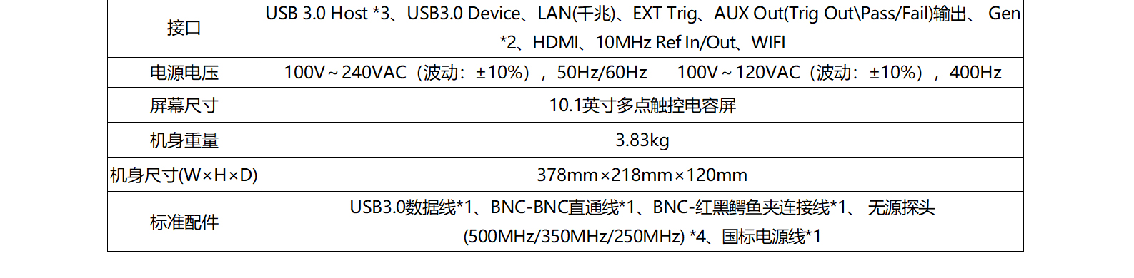 10.1 英寸触控屏,支持Multi-Windows支持多窗口显示丰富的接口:USB 3.0 Host *3、USB 3.0 Device、LAN(千兆)、EXT Trig、 AUX Out(Trig Out\Pass/Fail)输出、Gen *2、HDMI、10MHz Ref in/Out、WiFi。